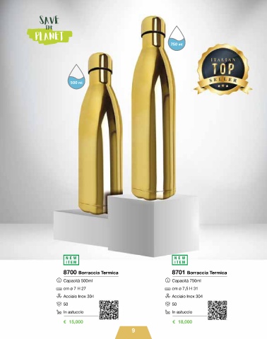 750 ml 500 ml 8700 Borraccia Termica 8701 Borraccia Termica Capacità 500ml Capacità 750ml cm ø 7 H 27 cm ø 7,5 H 31 Acciaio Inox 304 Acciaio Inox 304 50 50 In astuccio In astuccio € 15,000 € 18,000 9