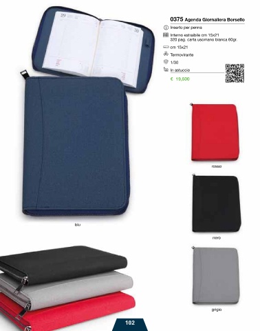 0375 Agenda Giornaliera Borsello Inserto per penna Interno estraibile cm 15x21 320 pag. carta usomano bianca 60gr. cm 15x21 Termovirante 1/30 In astuccio € 19,500 rosso blu nero grigio 102