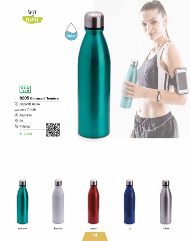 820 ml 8205 Borraccia Termica Capacità 820ml cm ø 7 H 26 Alluminio 60 Polybag € 7,500 arancio bianco rosso blu silver 14