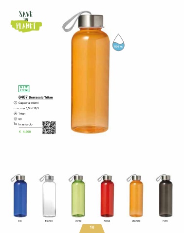 500 ml 8407 Borraccia Tritan Capacità 500ml cm ø 6,5 H 19,5 Tritan 50 In astuccio € 4,200 blu bianco verde rosso arancio nero 18