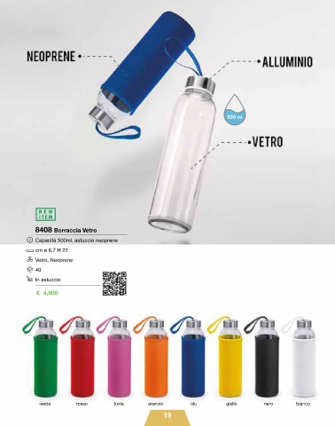 500 ml 8408 Borraccia Vetro Capacità 500ml, astuccio neoprene cm ø 6,7 H 22 Vetro, Neoprene 40 In astuccio € 4,500 verde rosso fuxia arancio blu giallo nero bianco 19
