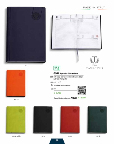 blu 0164 Agenda Giornaliera 320 pag. carta usomano bianca 60gr., rubrica stampata cm 11x17 Printflex termovirante 20 € 5,700 Su richiesta astuccio A003 € 0,390 arancio verde acido nero rosso verde 28