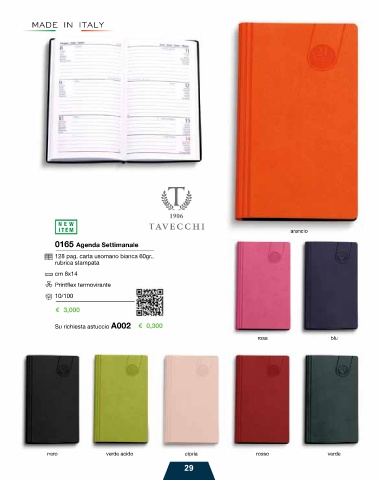 arancio 0165 Agenda Settimanale 128 pag. carta usomano bianca 60gr., rubrica stampata cm 8x14 Printflex termovirante 10/100 € 3,000 Su richiesta astuccio A002 € 0,300 rosa blu nero verde acido cipria rosso verde 29