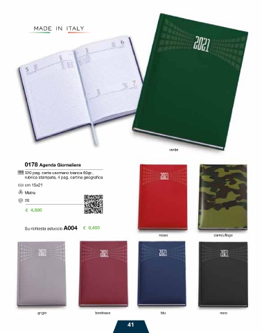 verde 0178 Agenda Giornaliera 320 pag. carta usomano bianca 60gr., rubrica stampata, 4 pag. cartina geografica cm 15x21 Matra 20 € 4,500 Su richiesta astuccio A004 € 0,450 rosso camouflage grigio bordeaux blu nero 41