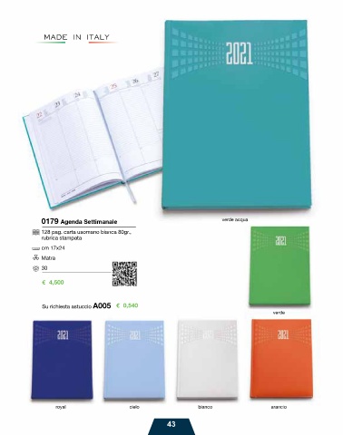 0179 Agenda Settimanale verde acqua 128 pag. carta usomano bianca 80gr., rubrica stampata cm 17x24 Matra 30 € 4,500 Su richiesta astuccio A005 € 0,540 verde royal cielo bianco arancio 43