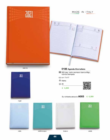 arancio 0186 Agenda Giornaliera 320 pag. carta usomano bianca 60gr., rubrica stampata cm 11x17 Matra 20 € 4,200 Su richiesta astuccio A003 € 0,390 royal cielo verde acqua bianco verde 44