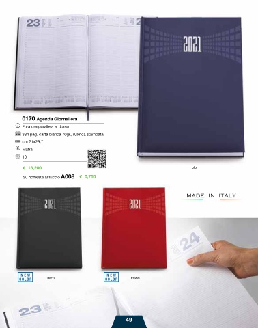 0170 Agenda Giornaliera Foratura parallela al dorso 384 pag. carta bianca 70gr., rubrica stampata cm 21x29,7 Matra 10 € 13,200 blu Su richiesta astuccio A008 € 0,750 nero rosso 49