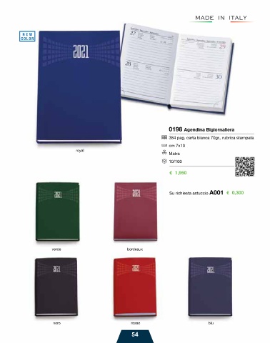 0198 Agendina Bigiornaliera 384 pag. carta bianca 70gr., rubrica stampata cm 7x10 royal Matra 10/100 € 1,950 Su richiesta astuccio A001 € 0,300 verde bordeaux nero rosso blu 54