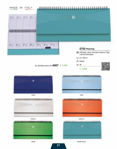 2752 Planning 128 pag. carta usomano bianca 70gr., rubrica stampata cm 30x15 Matra Su richiesta astuccio A007 € 0,450 20 € 4,200 royal cielo bianco arancio verde verde acqua 57
