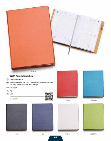 arancio 0327 Agenda Giornaliera Inserto per penna Interno estraibile cm 15x21, sabato e domenica abbinati, 320 pag. carta usomano bianca 60gr. cm 15x21 PU 1/30 € 8,100 rosso turhcese nero blu bianco verde lime 64
