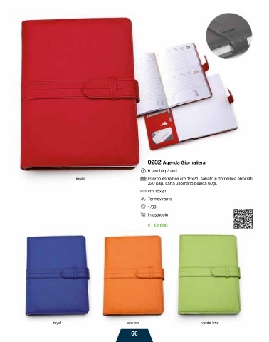 0232 Agenda Giornaliera 6 tasche p/card rosso Interno estraibile cm 15x21, sabato e domenica abbinati, 320 pag. carta usomano bianca 60gr. cm 15x21 Termovirante 1/30 In astuccio € 12,600 royal arancio verde lime 66