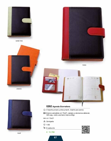 verde lime rosso arancio 0262 Agenda Giornaliera 3 tasche p/card, p/documenti, inserto per penna Interno estraibile cm 15x21, sabato e domenica abbinati, 320 pag. carta usomano bianca 60gr. cm 15x21 Similpelle 1/30 In astuccio € 11,700 royal 67