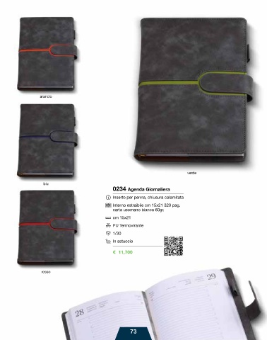 arancio verde blu 0234 Agenda Giornaliera Inserto per penna, chiusura calamitata Interno estraibile cm 15x21 320 pag. carta usomano bianca 60gr. cm 15x21 PU Termovirante 1/30 In astuccio € 11,700 rosso 73