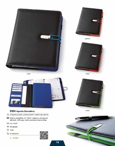 arancio royal rosso verde 0304 Agenda Giornaliera 5 tasche p/card, p/documenti, inserto per penna Interno estraibile cm 15x21, sabato e domenica abbinati, 320 pag. carta usomano bianca 60gr. cm 15x21 Similpelle 1/20 In astuccio € 18,900 74