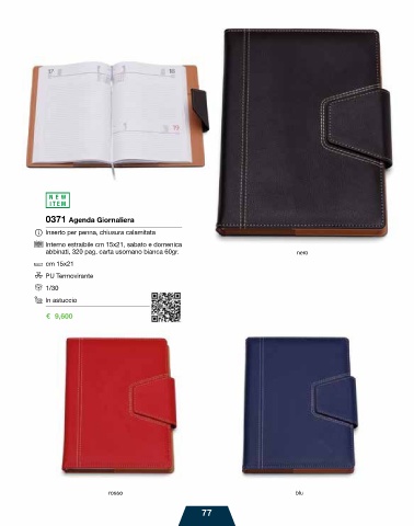 0371 Agenda Giornaliera Inserto per penna, chiusura calamitata Interno estraibile cm 15x21, sabato e domenica abbinati, 320 pag. carta usomano bianca 60gr. nero cm 15x21 PU Termovirante 1/30 In astuccio € 9,600 rosso blu 77