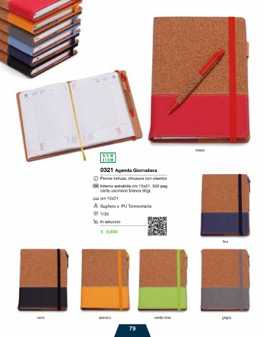 rosso 0321 Agenda Giornaliera Penna inclusa, chiusura con elastico Interno estraibile cm 15x21, 320 pag. carta usomano bianca 60gr. cm 15x21 Sughero e PU Termovirante 1/30 In astuccio € 9,600 blu nero arancio verde lime grigio 79