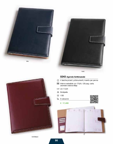 blu nero 0243 Agenda Settimanale 4 tasche p/card, p/documenti, inserto per penna Interno estraibile cm 17x24, 128 pag. carta usomano bianca 80gr. cm 17x24 Similpelle 1/30 In astuccio € 17,400 bordeaux 86