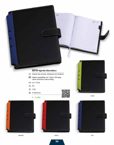 0218 Agenda Giornaliera Inserto per penna, chiusura con bottone Interno estraibile cm 17x24, 324 pag. carta usomano bianca 60gr. cm 17x24 PU 1/30 In astuccio verde € 17,400 arancio rosso blu 94
