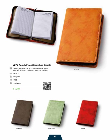 0273 Agenda Pocket Giornaliera Borsello Interno estraibile cm 9x13, sabato e domenica arancio abbinati, 320 pag. carta usomano bianca 60gr. cm 9x13 Similpelle 1/100 In astuccio € 7,500 marrone verde lime rosso 97