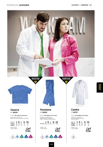Casacca unisex con collo a “ V “. Pantalone unisex fondo dritto. Camice unisex con bottoni.