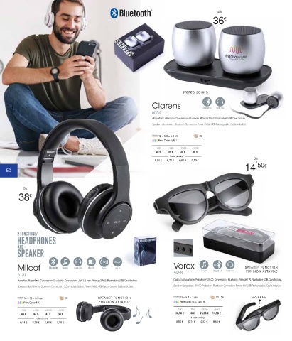 Speakers Headphones. Bluetooth Connection. 3,5 mm Jack Socket. Power 3Wx2. USB Rechargeable. Cable Included. Speaker Sunglasses. UV400 Protection. Bluetooth Connection. Power 1W. USB Rechargeable. Cable Included.